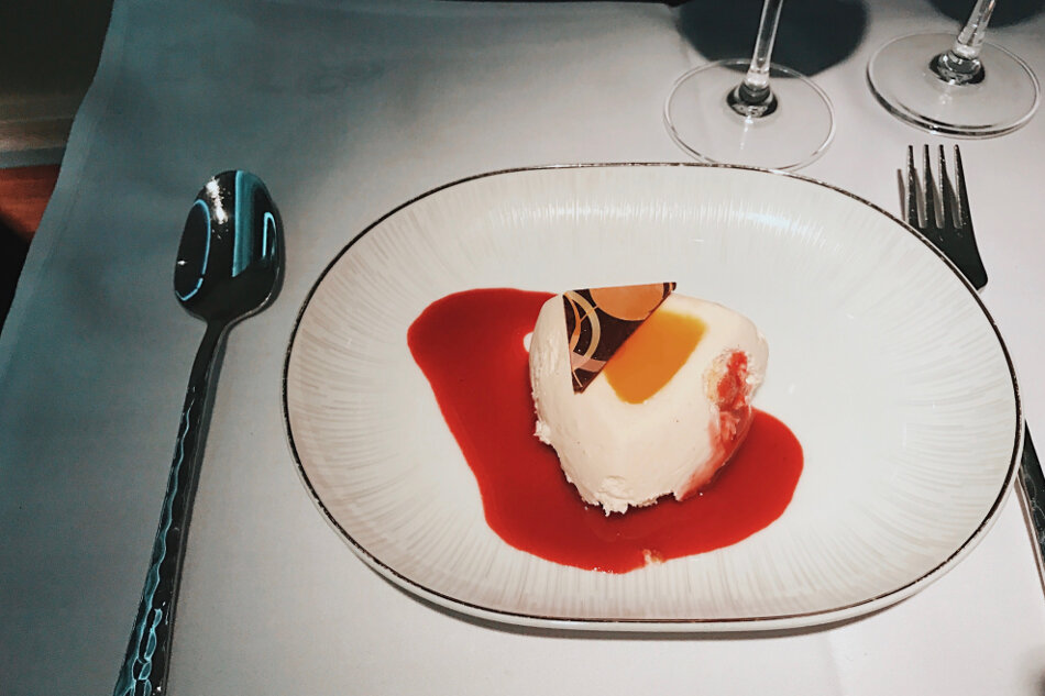 Kurz vor Bukarest war es Zeit für das Abendessen, das mit einem kleinen Hühnchen-Bacon-Avocado-Salat begann, es folgte ein Traum von einem Tenderlion samt grünem Spargel und Kartoffeln. Das war ein echter Knaller und sicher eines der besten Flugzeug-Steaks seit langer Zeit. Das Dessert war ein überraschend leckerer Riso-Cake (ich glaube, das ist eine Art Reiskuchen!?) mit Erdbeersoße – yummie. Auch die Präsentation stimmte, dazu gab es genug köstlichen Traubensaft, also wirklich perfekt.