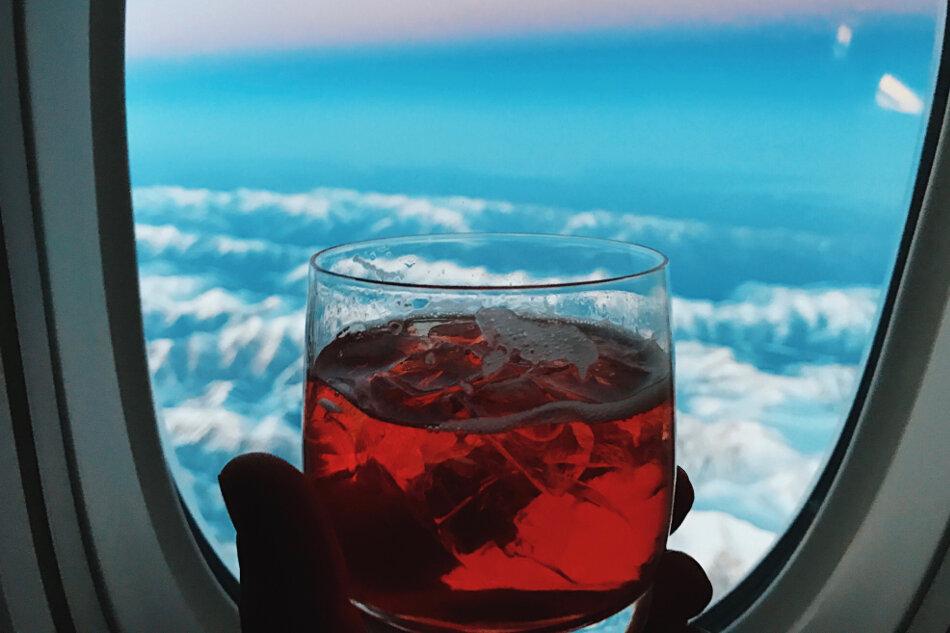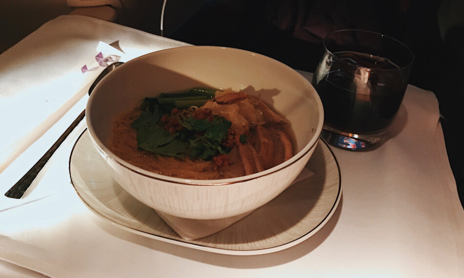 Nach einem Stündchen oder etwas länger wachte ich über Aserbaidschan wieder auf. Die Sonne schickte sich gerade an unterzugehen und bot, in Kombination mit den schneebedeckten Wipfeln des Großen Kaukaus, ein fantastisches Schauspiel. Das ist einer der Gründe, wieso ich so gerne fliege, diese wunderschöne Aussicht vor Augen, dazu ein Negroni in der Hand – einfach nur geil. Der Alkohol schmeckte schon wieder zu gut und so konnte eine weitere Stärkung nicht schaden. Außerdem wollte ich dir ja auch ein möglichst gutes Bild des Service wiedergeben und so musste ich natürlich auch etwas aus dem All-Day-Dine-Angebot probieren. Eine Yellow Noodle Soup sollte es sein und die war auch in der Tat echt sehr lecker.
