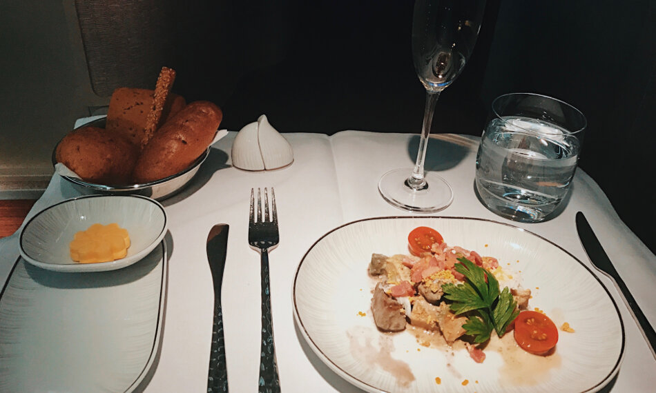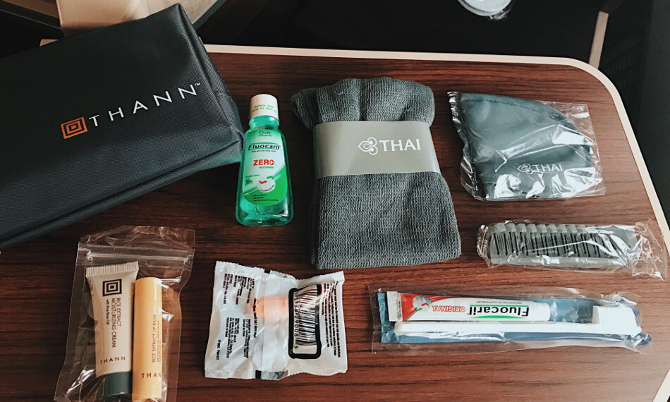 Auch auf diesem Tagflug lag natürlich ein Kissen und eine Decke auf meinem Platz bereit, dazu gab es Slipper und ein Amenity-Kit. Statt von Samsonite war dieses vom thailändischen Kosmetik-Brand Thaan, der Inhalt war jedoch identisch: Schlafbrille, Socken, Ohrstöpsel, Lippenbalsam und Feuchtigkeitscreme, Zahnbürste und -pasta, Mundwasser und eine Haarbürste. Die FA, ich korrigiere meine FA erschien und erkundigte sich nach meinem Getränkewunsch, ein stilles Wasser für mich. Okay, kleiner Scherz … Champagner geht halt immer, das Glas Wasser gibt es dazu, außerdem noch ein heißes Tuch. Ein guter Einstand und ich kann es bereits vorwegnehmen, es sollte so weitergehen.