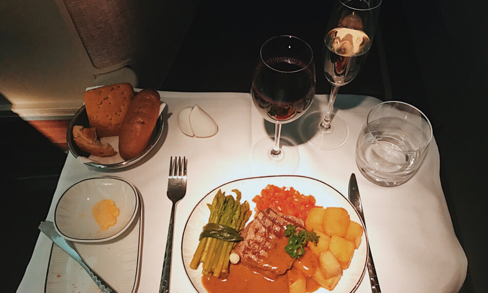 Während hinter dem neuen Terminalgebäude dunkle Wolken aufziehen, düsen wir in Richtung offenes Meer, ein kurzer Steigflug und schon geht der Service weiter. Noch ein Glas Champagner, dazu Nüssen und die Essens- und weiteren Getränke wünsche werden abgefragt.