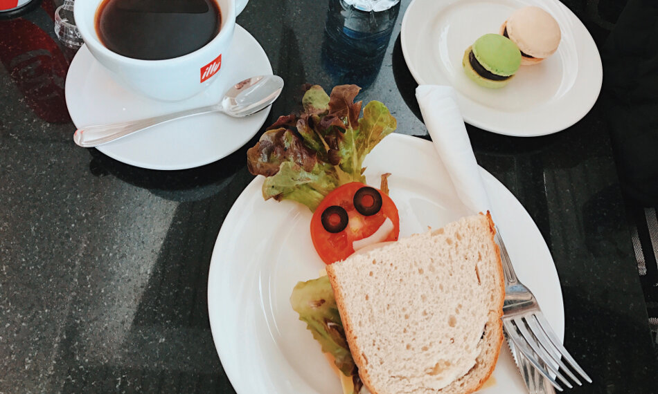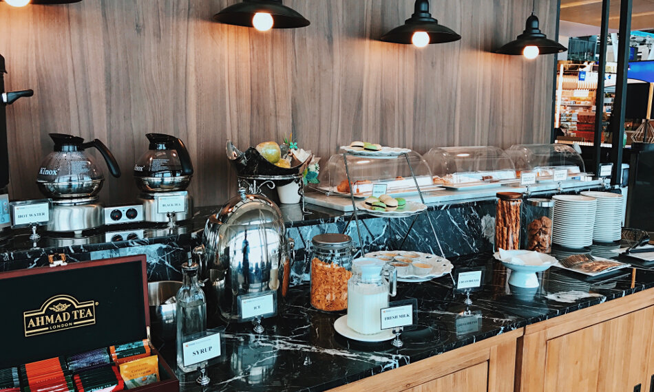 Nach dem ersten kleinen Schock (ich wusste vorher nicht, dass es noch keine Lounge gibt), inspizierte ich natürlich erst einmal das Buffet. Ein paar kalte Snacks wie Sandwiches, dazu Cornflakes, Macaroons, Cookies und derartiges, insgesamt okay aber nichts herausragendes. Doch es gibt auch eine Karte, aus der man bestellen kann. Neben allerlei Kaffeespezialitäten auch z.B. Instant-Noodle-Soup und Sandwiches, diese werden wie auch der Kaffee vom gegenüberliegenden Bistro direkt für jeden Gast geholt. Eine nette Idee und zumindest der Versuch seinen Premium Gästen so etwas wie Komfort zu bieten. Dadurch, dass sich der Bereich am Ende des Terminals befindet, ist es hier verhältnismäßig ruhig. Ein Stück weiter geht es hinaus auf die Terrasse, so dass auch die Raucher noch vor Abflug auf ihre Kosten kommen, die Toiletten befinden sich schräg gegenüber der Lounge-Rezeption in der Nähe des Gewürz-Shops. Das Gate für meinen Flug nach Frankfurt befand sich direkt unterhalb der Lounge, der Fahrstuhl befindet sich direkt hinter dem Empfangs-Tresen, alternativ gibt es eine Rolltreppe gegenüber des Eingangsbereiches, so dass ich innerhalb von Minuten am Gate war.